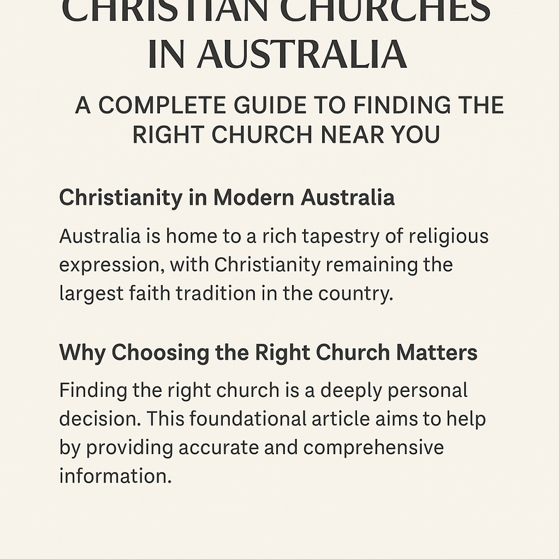 Across the nation—from bustling cities like Sydney and Melbourne to small regional towns—Christian churches of all kinds continue to serve as places of worship, community, guidance, and hope. Whether traditional or contemporary, large or small, these churches reflect the spiritual diversity and evolving faith journeys of Australians today.